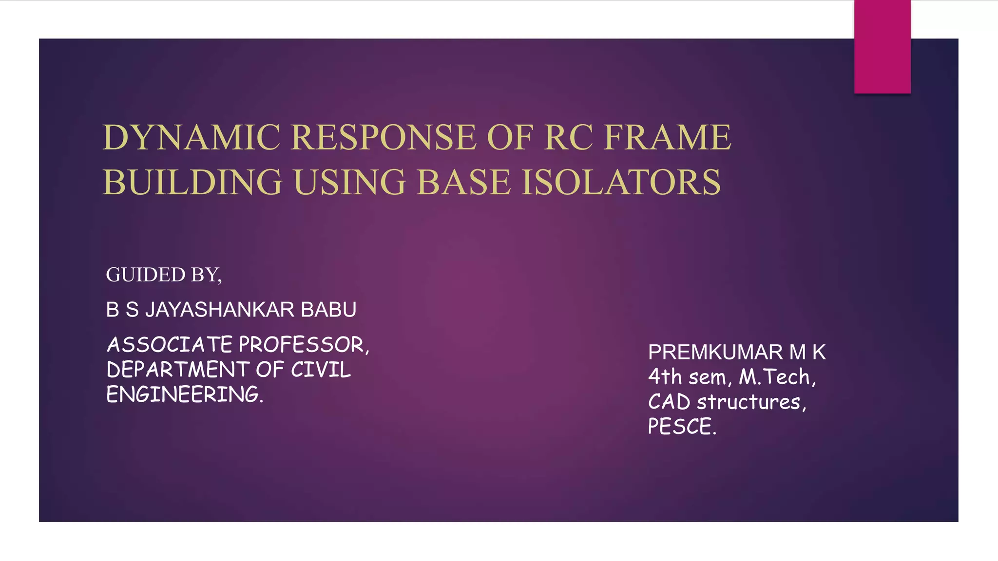 The document discusses the dynamic response of a 14-storey reinforced concrete frame building using base isolators. It aims to analyze the response of the building with and without base isolators, including lead rubber bearings and sliding bearings, under earthquake ground motions. The analysis is performed using the finite element software ETABS. The results show that base isolation is effective at reducing seismic responses like displacement, acceleration, base shear and storey drift compared to a fixed base building. PTFE isolators provide more reduction than LRB isolators in most responses. Irregularities in building plan and elevation also increase the response of a fixed base building.