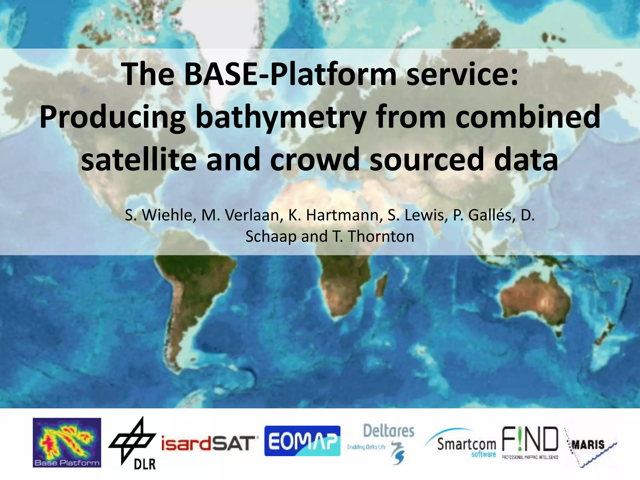 The document discusses the Base-Platform project, which aims to produce bathymetric data by combining various satellite and crowd-sourced methods. Bathymetry is crucial for numerous applications such as navigation, construction, and environmental management, as a significant portion of the ocean floor remains unsurveyed. The project offers accessible data through a web portal, providing users with 'good enough' solutions that are more cost-effective than traditional survey methods while still being precise enough for many applications.