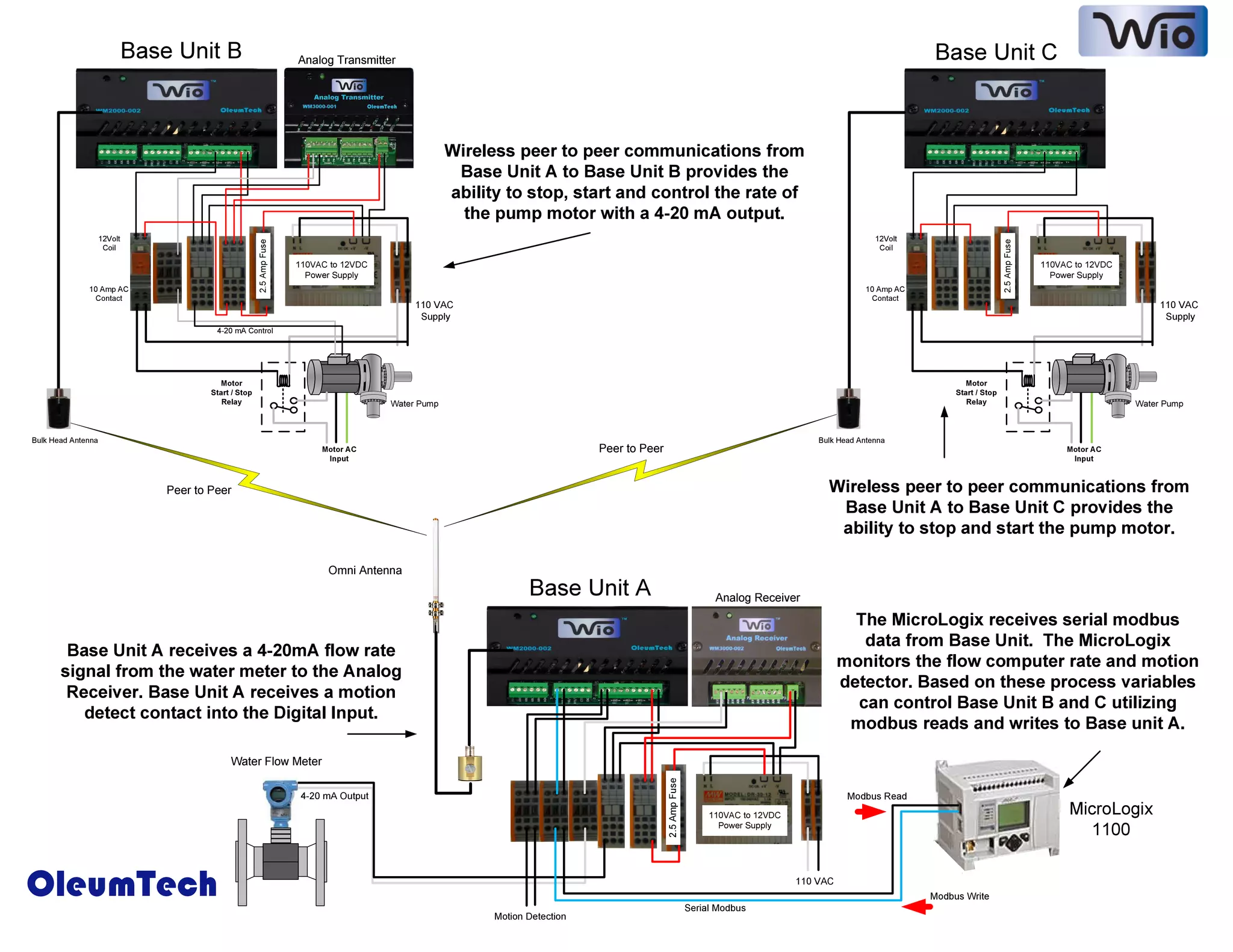 The document describes a wireless peer-to-peer communications system with 3 base units (A, B, C) that can control and monitor a water pump motor and flow rate. Base Unit A receives a 4-20mA flow signal and motion detection input. It communicates with Units B and C to start, stop, and control the pump motor's speed. The MicroLogix PLC receives data from the flow computer and motion detector via Base Unit A to monitor process variables and control the base units using Modbus communications.