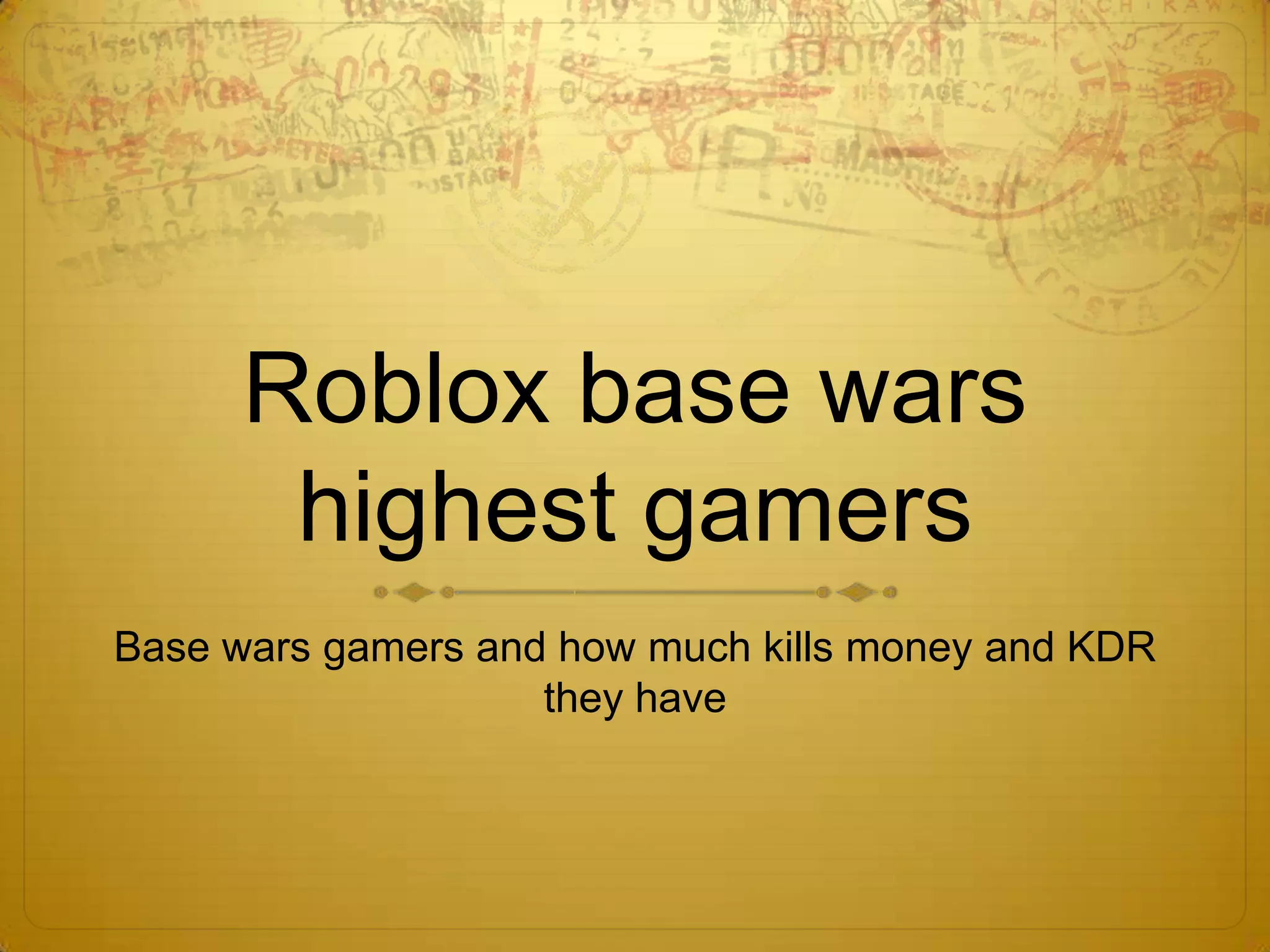 Base wars is a popular game on Roblox where players build bases and fight each other. The document discusses the top players in this game and provides statistics on their kills, money earned, and KDR (kill-death ratio). It aims to showcase the highest performing gamers and their accomplishments in base wars.