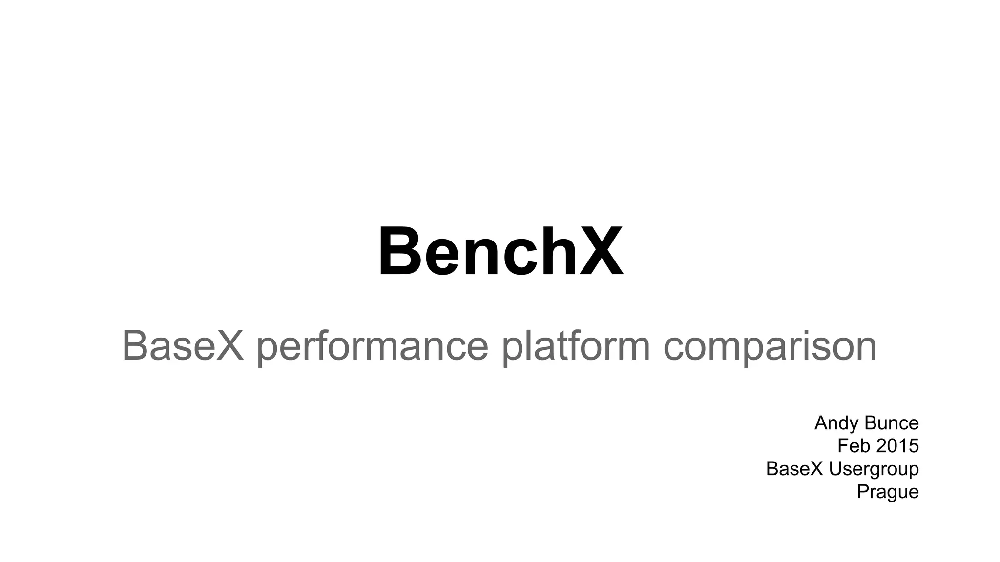 BenchX is a web application for comparing the performance of BaseX across different platforms and configurations. It was developed to provide quantitative comparisons through standardized queries, such as those from the XMark benchmark. The application enables users to view and analyze performance results via a user-friendly interface, supporting multiple deployment environments like Docker and AWS.