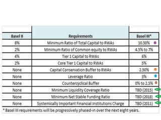 - Basel I, introduced in 1988, required banks to hold capital equal to 8% of risk-weighted assets. It aimed to ensure adequate capital levels and competitive banking markets.
