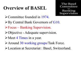 The document provides information on Basel committees and accords. It discusses the following: