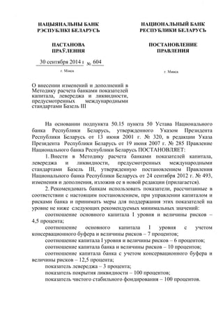 Постановление правления национального банка Республики Беларусь от 30 сентября 2014 года вносит изменения в методику расчета показателей капитала, левереджа и ликвидности согласно международным стандартам Базель III. В нем установлены минимальные нормы для банков, включая соотношения капитала и уровни ликвидности, а также определены обязанности для главного управления банковского надзора и информационных технологий. Документ вступает в силу с момента его принятия.