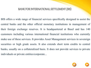The Bank for International Settlements (BIS) provides financial services to central banks to help them manage their foreign exchange reserves. Headquartered in Basel, it has 140 central bank customers. It offers asset management and short-term credit services on a collateralized basis, but not to private individuals or entities. Important events highlighted by the document include the Herstatt Crisis of 1974, the Basel Concordat of 1974 establishing supervision guidelines between countries, and the Basel Capital Accords of 1988 and beyond establishing capital adequacy standards for banks.