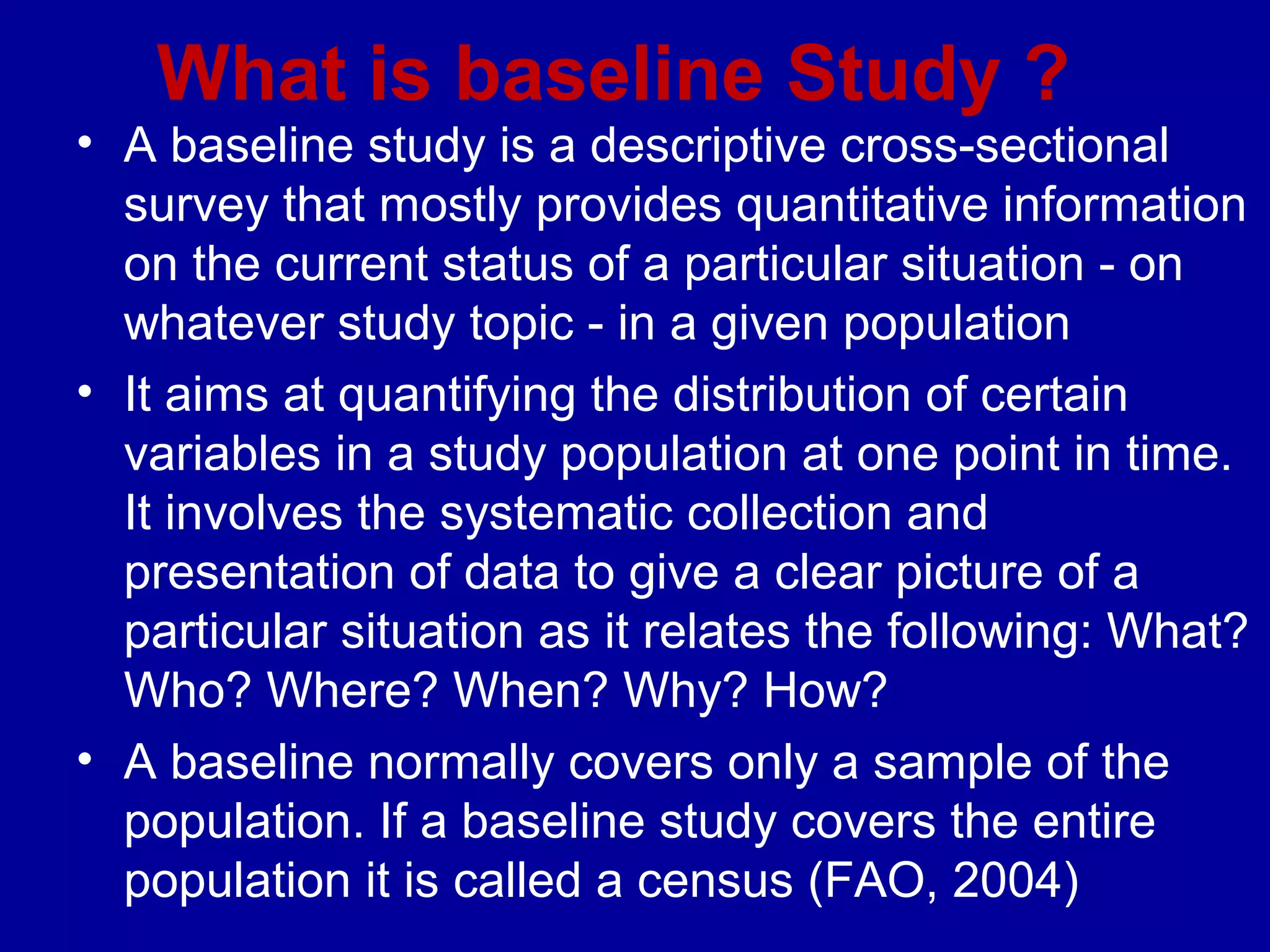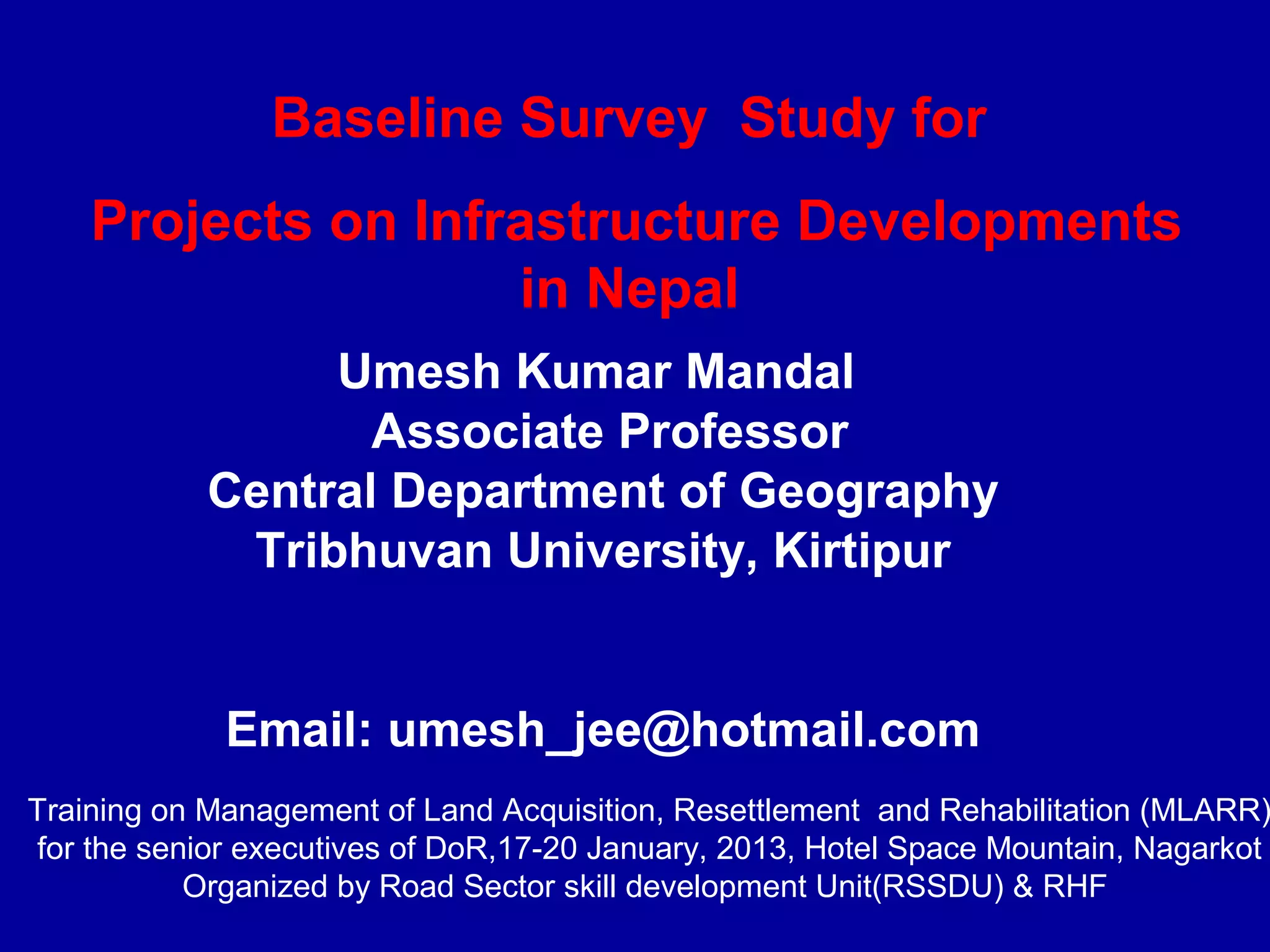 The document provides information on baseline studies for infrastructure development projects in Nepal. It defines a baseline study as a cross-sectional survey that quantifies the current status of a situation in a given population. It aims to measure the distribution of variables at a single point in time. The baseline establishes starting values that can be compared to endline data to assess changes resulting from a project. The document outlines the key components of conducting a baseline study, including objectives, research methodology, data collection and analysis.