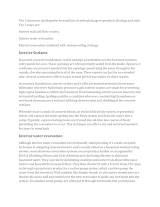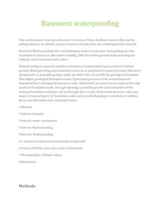 Basement waterproofing involves techniques to prevent water from entering a building's basement, primarily through interior sealants, interior water evacuations, and exterior waterproofing methods. These methods address hydrostatic pressure that causes water infiltration, which can lead to structural damage and issues like mold. Effective waterproofing is essential for maintaining the integrity of a structure, and various methods exist to manage water entry and damage.