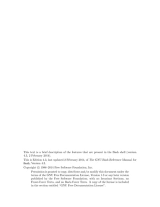 This document summarizes the features of the Bash shell version 4.3, last updated in February 2014. It provides definitions of key terms, an overview of basic shell features like syntax, commands, parameters and expansions. It also describes shell scripting, builtin commands, variables and other Bash-specific features. The manual is intended as a reference for using and programming with the Bash shell.
