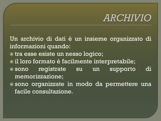 Un database è una raccolta organizzata di informazioni che consente facile consultazione e manipolazione dei dati. La progettazione dei database passa attraverso modelli concettuali, logici e fisici, con un uso predominante del modello relazionale che organizza i dati in tabelle. Un sistema di gestione di database (DBMS) permette la creazione e gestione di queste informazioni, assicurando la loro integrità attraverso l'uso di chiavi primarie ed esterne.