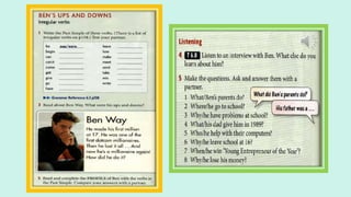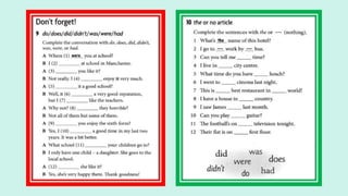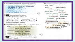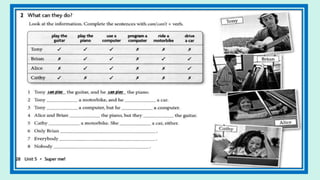 This document contains the class rules and lesson plan for an English class taught by Miss Wendy. It includes sections on what students can and can't do, examples of abilities and questions students can ask each other about their abilities. There are also examples of common questions in English and Spanish. The lesson focuses on verbs like "can" and "can't" and provides exercises for students to practice asking and answering questions using these verbs.