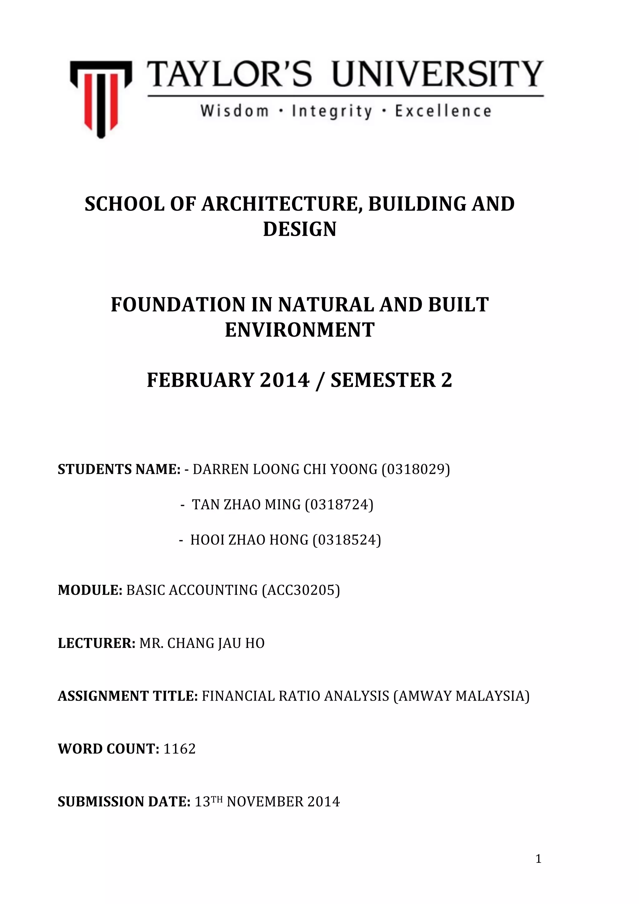 This document contains financial analysis of Amway Malaysia for the years 2012 and 2013. It includes the income statement, balance sheet, and calculation of various profitability and stability ratios. The profitability ratios like net profit margin, gross profit margin, and expense ratios improved from 2012 to 2013, indicating better management of costs. The stability ratios like working capital, debt, and inventory turnover also improved over this period. However, the P/E ratio of 18 times suggests the shares are overvalued currently. Overall, the financial health and performance of Amway Malaysia seems good based on the ratio analysis, but the shares may not be a good investment at the current price.