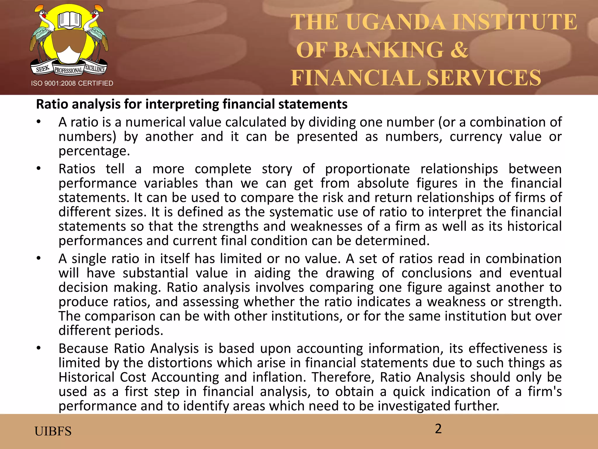 This document provides an overview of key financial ratios used to analyze the financial performance and health of banking institutions. It discusses ratios categorized as profitability, liquidity, asset quality, efficiency, and capital/solvency ratios. Specific ratios covered include net margin, cost-to-income, return on equity, return on assets, current ratio, non-performing loans ratio, debt-to-equity, and capital-to-risk weighted assets. The document emphasizes that analyzing multiple ratios together provides a fuller picture of a bank's financial standing than any single ratio alone.