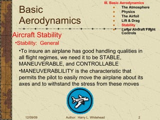 The document discusses the concepts of stability, maneuverability, and controllability as they relate to aircraft design. It states that stability causes an aircraft to return to steady flight after a disturbance, maneuverability allows the pilot to move the aircraft easily about its axes, and controllability is the ability to respond to pilot inputs. However, increasing one of these characteristics typically decreases another, so aircraft designs involve compromises. The document then examines longitudinal, lateral, and directional stability in more detail.
