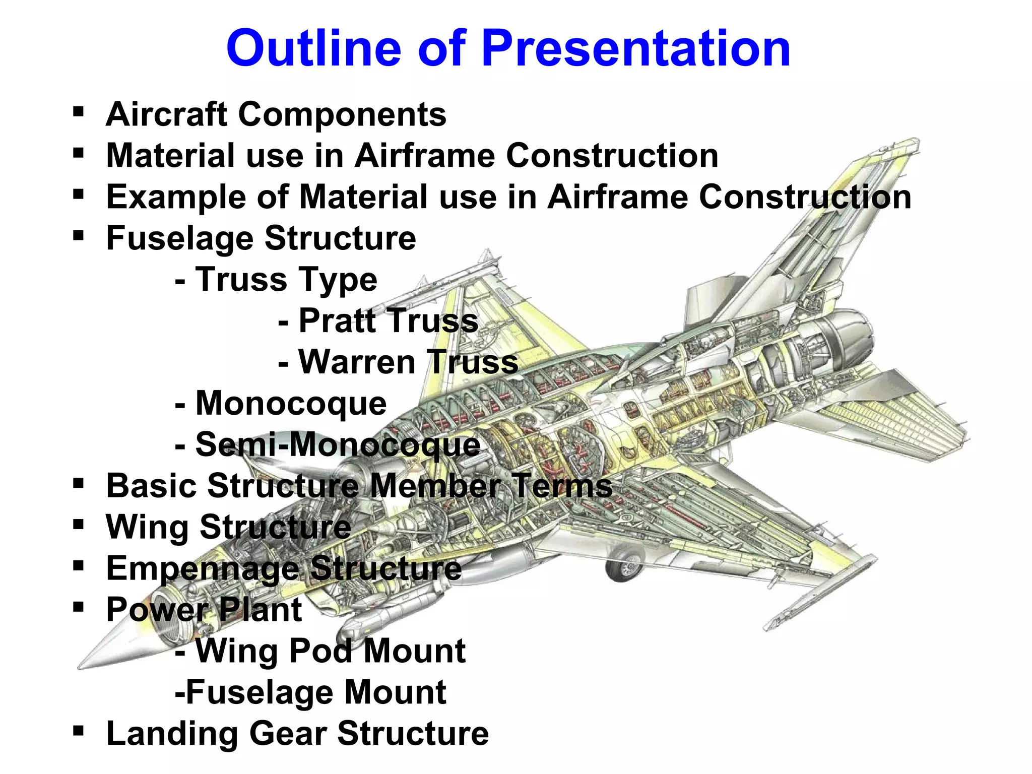 The document provides an overview of the basic components and structures of aircraft, including the fuselage, wings, empennage, power plant, and landing gear. It describes the typical materials used in aircraft construction and gives examples of different structural designs for the fuselage, wings, empennage, and landing gear. Key terms related to aircraft components and structures are also defined.