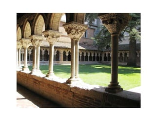This document contains definitions of basic architectural terms related to churches and cathedrals, including monastery, portal, altar, apse, arch, bell tower, choir, cloister, crypt, column, dome, facade, barrel vault, fan vault, Gothic cathedral, buttress, nave, pointed arch, ribbed vault, pinnacle, gargoyle, rose window, stained glass, triptych, and weather vane. It provides the essential vocabulary needed to describe common features of Romanesque and Gothic religious buildings.
