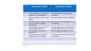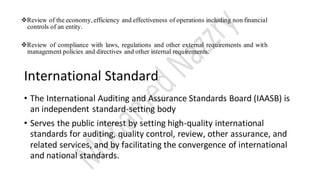 The document discusses the scope and objectives of internal auditing, which includes monitoring internal controls, examining financial and operating information, reviewing the economy, efficiency and effectiveness of operations, and reviewing compliance with laws, regulations, policies, and directives. It also discusses international and local auditing standards, the audit process, planning an audit, conducting an audit exit conference, drafting and issuing the audit report, obtaining client responses, and following up after an audit is completed. The auditor aims to evaluate controls, ensure compliance, and recommend improvements through thorough planning, examination of documentation and processes, and open communication with clients.