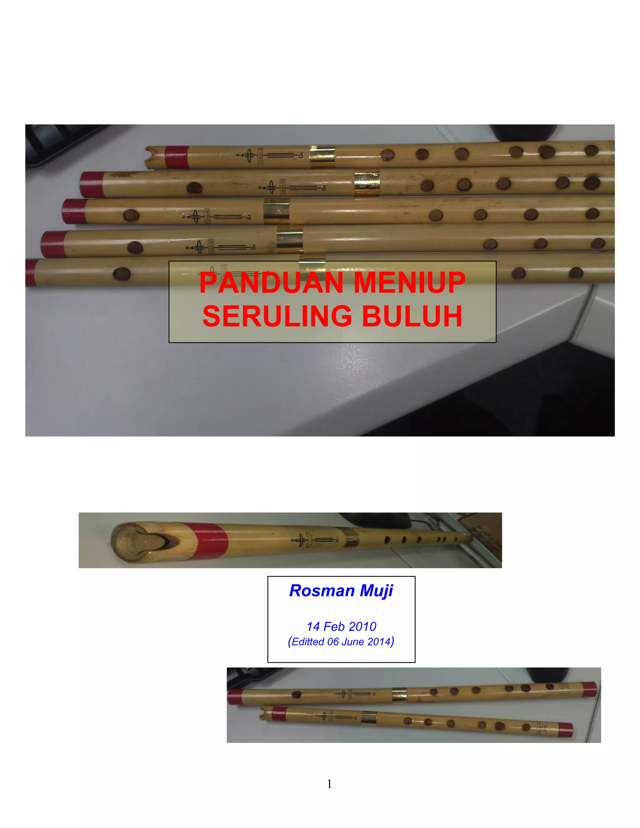 Dokumen ini adalah panduan untuk memainkan seruling buluh, termasuk cara memegang dan meniup seruling dengan posisi jari yang tepat. Ia juga memberikan tips tentang embouchure dan pengaliran angin untuk menghasilkan nada yang bersih serta teknik perawatan seruling. Terdapat juga chart fingering untuk berbagai kunci nada dan latihan untuk pemula.