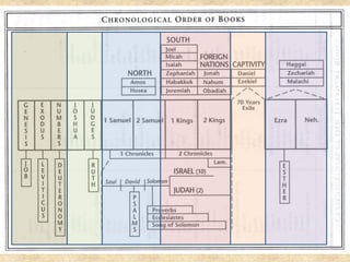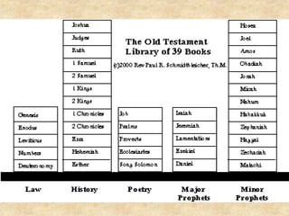 The Old Testament contains 39 books, divided into five sections: the Pentateuch, historical books, poetic books, major prophets, and minor prophets, primarily focusing on the relationship between God and Israel. Key events include the creation, the covenant with Abraham, the deliverance from Egypt by Moses, and the giving of the Ten Commandments. It culminates in prophecies of a coming Messiah and ends with the historical account of the Jewish people until the period of silence before the New Testament.