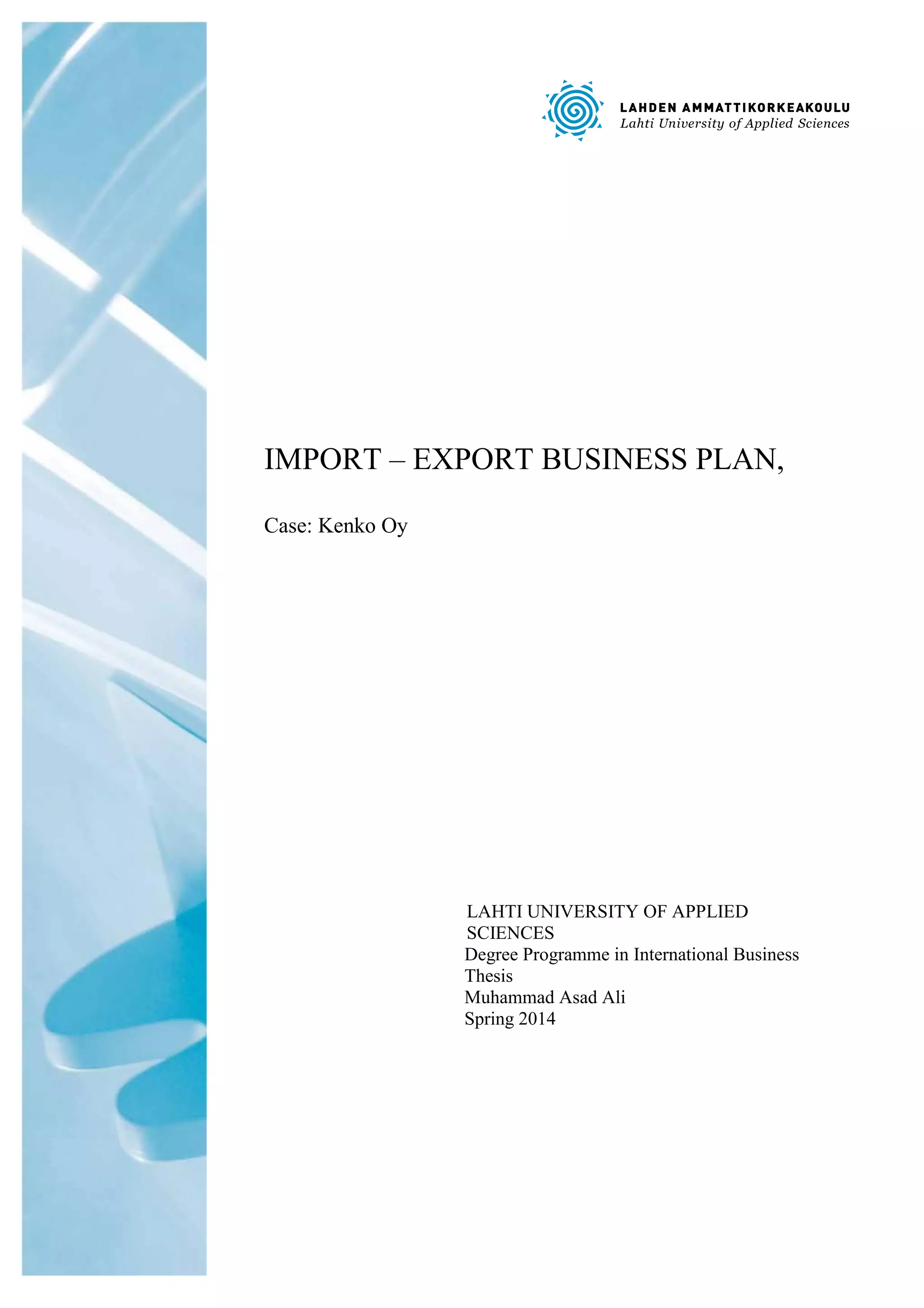 This document provides an import-export business plan for a company called Kenko Oy. It begins with an introduction that discusses the background and objectives of the thesis, which is to create a business plan for an import-export company and provide knowledge about this industry. It then covers various aspects of business planning, including the key elements of a business plan, different types of plans, and business models. Next, it analyzes Pakistan as a potential business partner and discusses trade between Finland and Pakistan. The business plan for Kenko Oy is then presented, covering aspects like marketing, competition, the business model, finances, and sales. A SWOT analysis of the company is also included. The conclusion discusses answering the research questions and