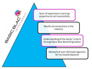 The document discusses property investment in South Africa as a means of wealth creation. It outlines three main ways to make money in property: 1) appreciating property value over 5-10 years then selling for a profit, 2) renovating and quickly reselling properties for profit, and 3) renting out a property portfolio as long-term assets. It also notes current opportunities in the market from bank repossessions and auctions. Fees for purchases facilitated by Basic Blac are provided. The risks, responsibilities, and process for purchasing auction properties are explained.