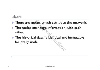 This document discusses key concepts related to decentralized networks and blockchain technology. It begins by describing the basic components of a blockchain network, including nodes that exchange information and maintain an identical and immutable record of historical data. It then explores the differences between decentralized, fractal, distributed, and diversified network types. The document also notes some potential problems with decentralization, such as centralized elements like mining pools, hardware manufacturers, and exchanges. Finally, it provides an overview of distributed ledgers, peer-to-peer networks, and defines blocks and blockchains as sequences of immutable records of transactions.
