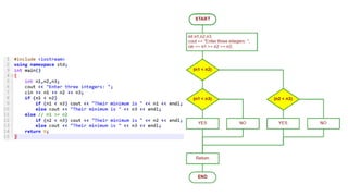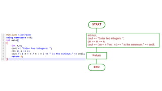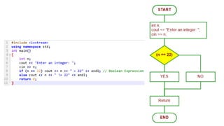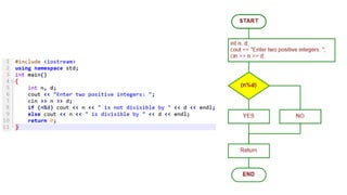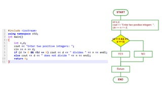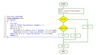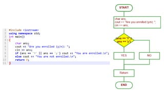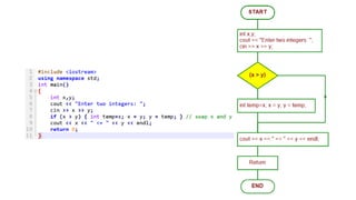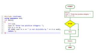 - Operators perform actions on objects like output with << and input with >>. Arithmetic, increment, assignment, and comparison operators are also covered.