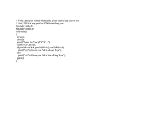 The document provides examples of basic C programs that demonstrate fundamental programming concepts like printing values, arithmetic operations, arrays, functions, conditionals, loops, and matrices. The programs cover topics such as printing and reading integers, adding/multiplying numbers, swapping values, checking vowels/consonants, Armstrong numbers, palindromes, summing matrices, and finding the transpose of a matrix.