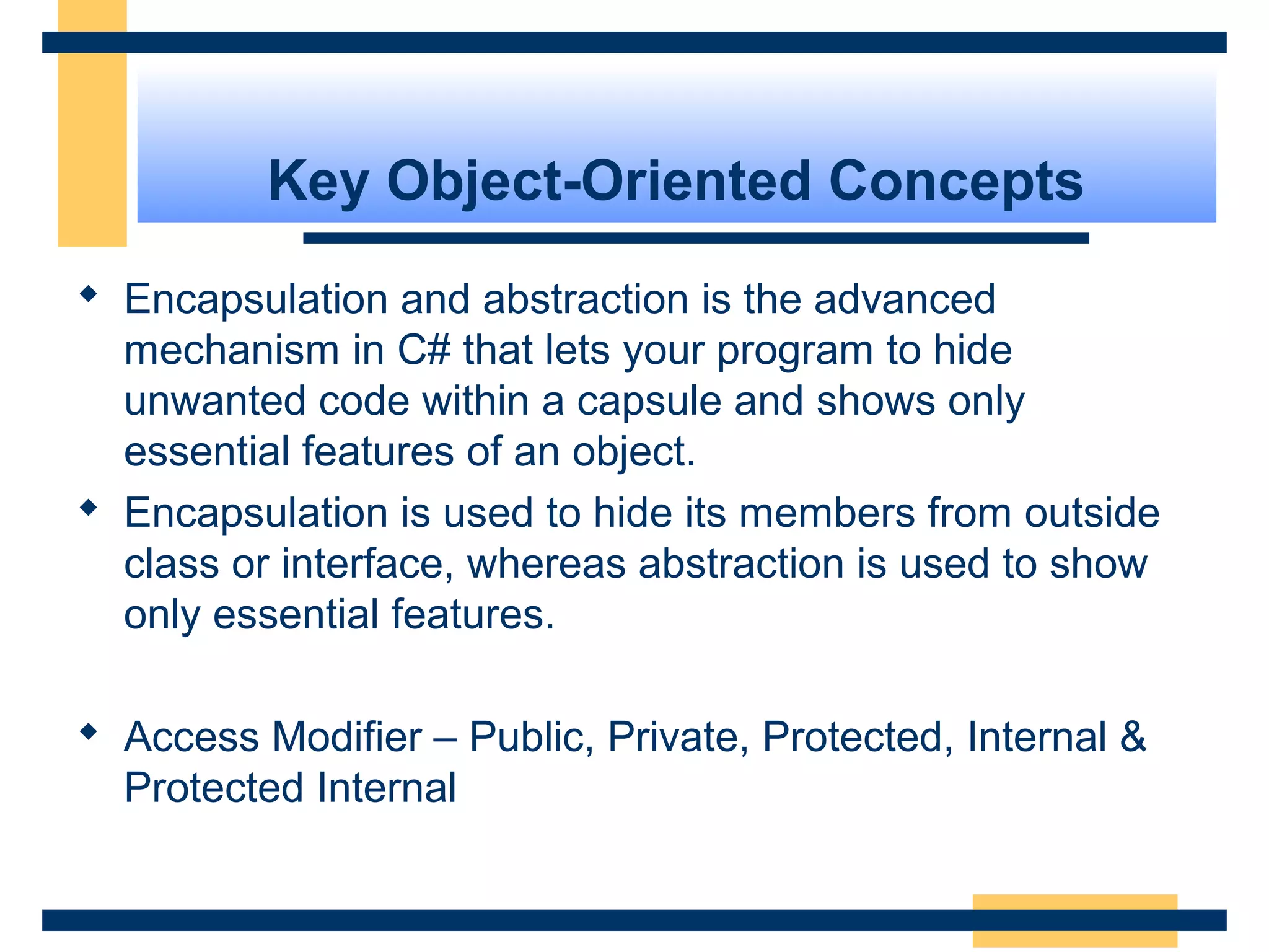 The document discusses various object-oriented programming concepts in C#, including abstraction, encapsulation, inheritance, polymorphism, interfaces, abstract classes, virtual methods, classes, sealed classes, and provides code examples for foreach loops, switch statements, arrays, data types, boxing and unboxing, overloading and overriding, interfaces, classes vs. structures, access modifiers, abstract classes, and sealed classes.