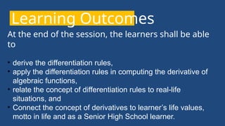 The document outlines the learning outcomes for students regarding the concept of derivatives in calculus, emphasizing the ability to derive differentiation rules and apply them to real-life situations. It provides detailed explanations and examples of various differentiation rules such as the power rule, product rule, and quotient rule, along with practical applications in business and population growth metrics. Additionally, it encourages learners to connect mathematical concepts to their personal values and experiences.