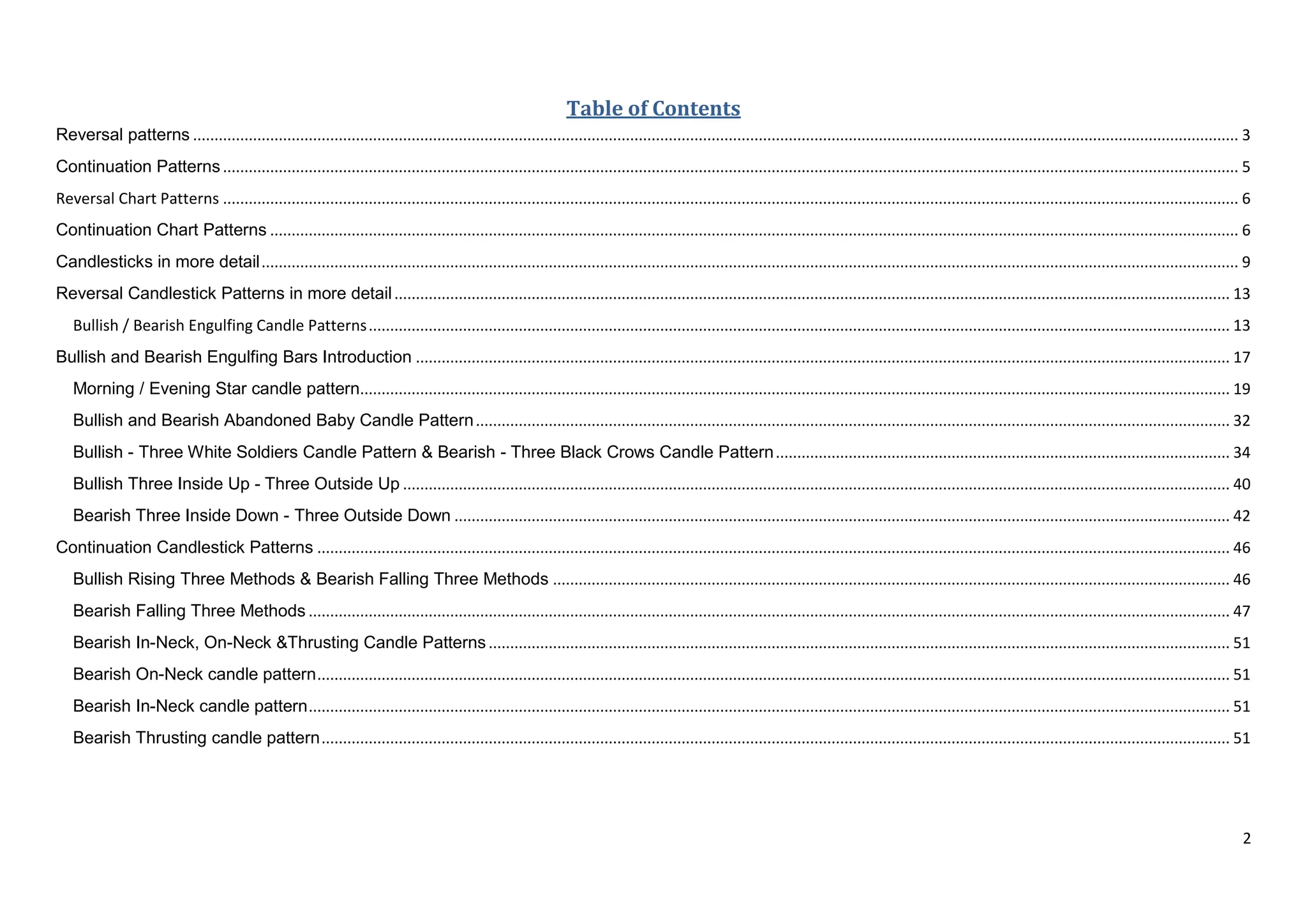 The document provides information on various candlestick patterns used in technical analysis of financial markets. It begins with definitions of basic candlestick types like doji and hanging man candles. It then outlines several reversal patterns like morning star and engulfing patterns that indicate a change in trend. Continuation patterns like rising three methods and falling three methods that suggest the current trend will persist are also discussed. The document provides illustrations and explanations of many common candlestick patterns to help readers understand how to interpret these visual representations of market price action.