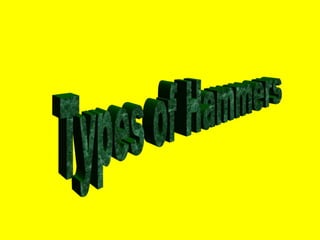 This document discusses different types of hammers used in carpentry. It describes claw hammers, straight claw hammers, drywall hammers, bricklayer's hammers, welder's hammers and other specialty hammers. It also discusses hammer handles, heads, weights and general maintenance tips. The ideal all-purpose hammer is a 16oz claw hammer with a handle that feels comfortable and balanced to the user. Proper use and storage can maximize a hammer's lifespan.