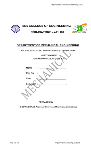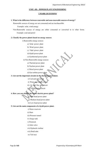 This document is a question bank for mechanical engineering students containing questions related to power plant engineering. It includes 2 mark questions about different types of power plants such as thermal, hydroelectric, diesel, nuclear and gas turbine power plants. The questions cover topics such as the basic components and classification of these different power plants. It also includes questions about pumps, turbines, cavitation and other related topics. The question bank was prepared by an assistant professor and contains 39 questions in total to help mechanical engineering students prepare for exams.