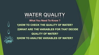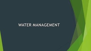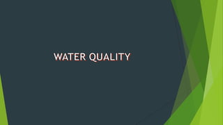 This document discusses water quality and management. It defines safe and adequate water supplies according to the WHO. It then discusses issues with water quality in places like Africa, Asia, and Latin America where disinfected water is often contaminated. The document outlines various water quality variables and management recommendations. It emphasizes adopting water demand management approaches like reducing unaccounted water, leakage detection, and public awareness campaigns to more sustainably manage limited water resources.