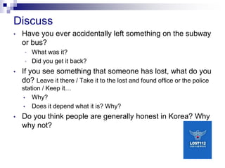 The document discusses leaving items on public transportation and what to do if you find a lost item. It asks questions about honesty in Korea and leaving personal items unattended in public spaces. It also discusses charities and providing polite requests in a board game by taking turns rolling dice and making accurate requests based on the space landed on.