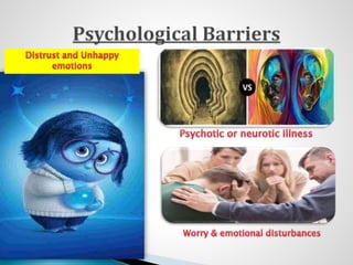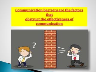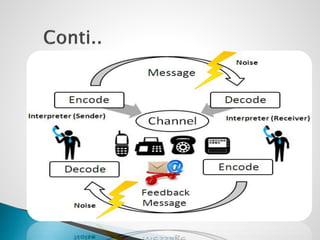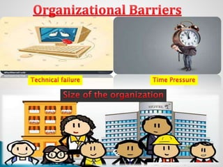 The document discusses communication and the communication process. It defines communication as transmitting information from one person to another and involves a sender, message, encoding, channel, receiver, decoding, and feedback. It describes verbal and nonverbal communication and lists common communication goals. The document also outlines barriers to communication such as physiological, psychological, social, cultural, environmental, semantic, organizational barriers and issues related to the communication process. It provides tips for overcoming barriers which include using the same language, considering cultural and social differences, and ensuring a comfortable environment for sharing information.