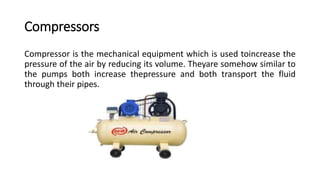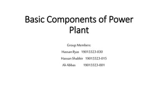 The document discusses the basic components of a power plant, including compressors, cooling towers, and turbines. It provides details on the types and workings of positive displacement and rotary compressors, natural draft, mechanical draft, and hybrid draft cooling towers, and water, steam, gas, and wind turbines. The summaries explain the key components and how they function to compress air or fluids, remove heat, and convert the kinetic or potential energy of water, steam, gas, or wind into rotational motion and ultimately electricity.