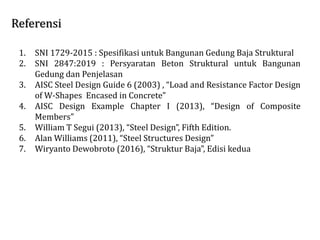 Dokumen ini membahas spesifikasi dan persyaratan struktur komposit kolom beton-baja, mencakup kapasitas tekan, tarik, momen, dan geser sesuai dengan standar SNI dan panduan desain AISC. Ditekankan juga keuntungan dan kekurangan dari penggunaan struktur komposit serta berbagai metode perhitungan kapasitas. Informasi ini penting untuk desain dan detail komponen dalam konstruksi bangunan gedung.