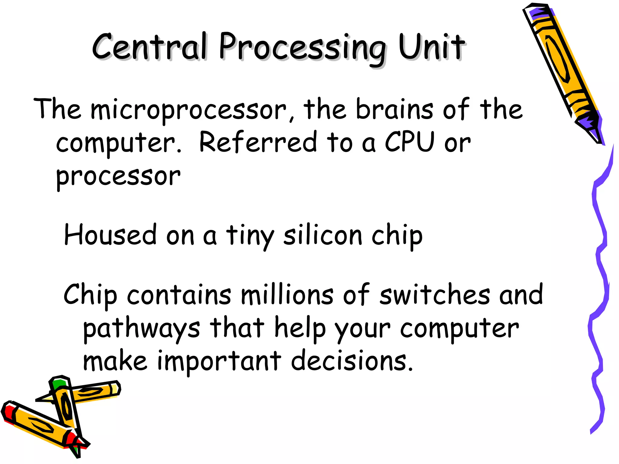 The document provides an overview of computer basics including hardware and software components. It describes the central processing unit (CPU) as the "brain" of the computer, which contains an arithmetic/logic unit that performs computations and a control unit that coordinates activities. It also discusses memory types like random access memory (RAM) and read-only memory (ROM). The document outlines other hardware components like controllers and ports, and describes software including operating systems, applications, and proper care of computer equipment and storage media.
