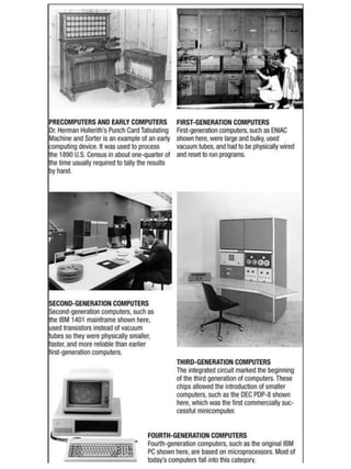 This document provides an overview of 5th generation computers, computers in education, the workplace, and for mobile use. It defines what a computer is and its basic functions of input, output, processing, communication, and storage. It also describes computer hardware, software, application software, computer networks, and how the Internet is the largest computer network. The document outlines current and future uses of computers across different settings and how they have become integrated tools for learning, work, and daily life.