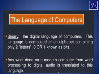 The document provides an overview of computer output devices, including monitors, printers, and plotters, while also explaining the various components of a computer system such as the motherboard, CPU, memory, and storage devices. It outlines the differences between types of memory (RAM and ROM), including their functions and classifications, as well as details on data and address buses. Additionally, it describes secondary storage options like HDDs, floppy disks, CDs, and USB drives alongside their respective connectors.