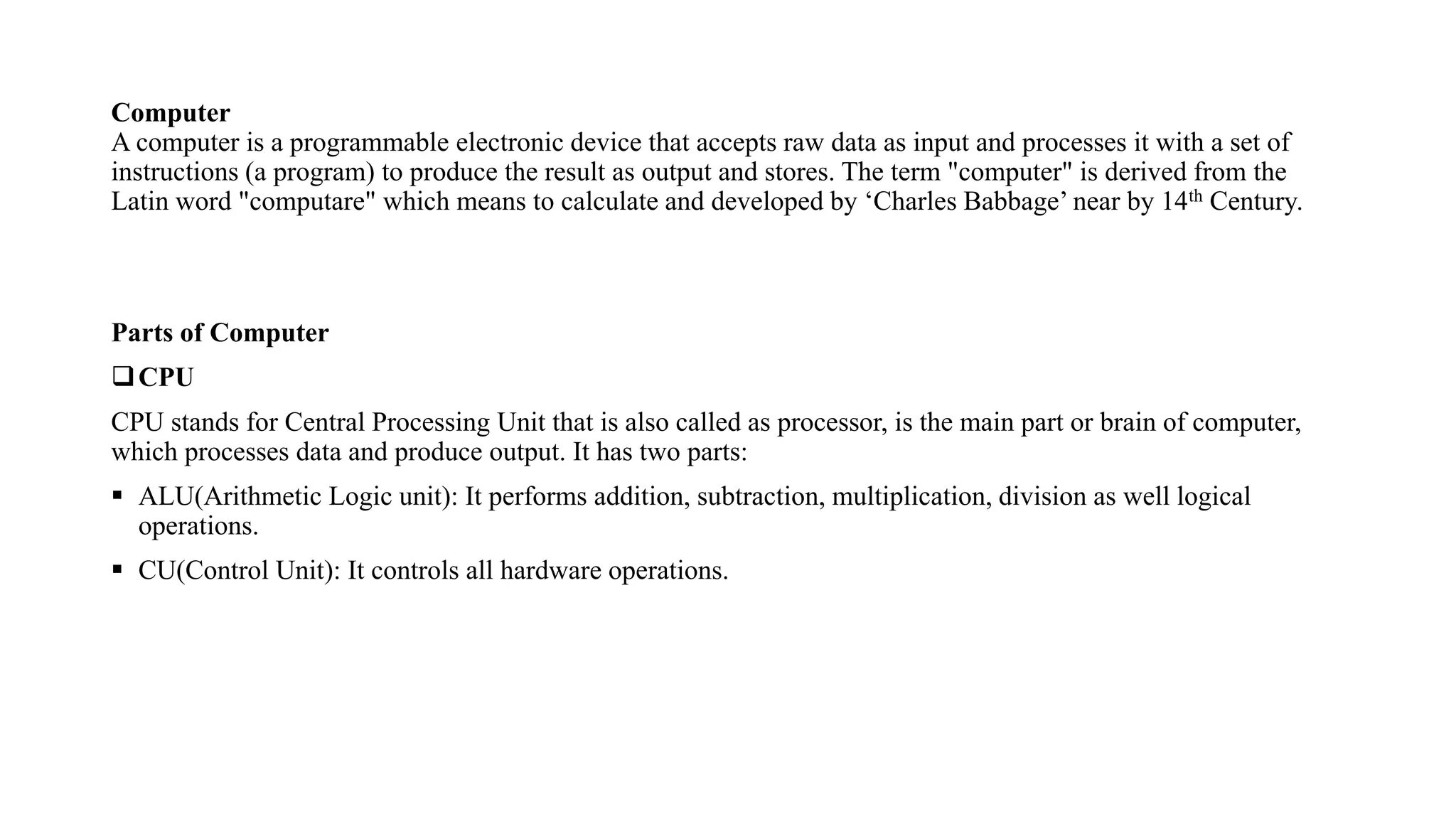 The document discusses the basic parts and functions of a computer. It defines a computer as an electronic device that accepts raw input, processes it using instructions from a program, and produces output. The main parts are identified as the CPU, input/output units, motherboard, and memory. The CPU contains the ALU and CU and acts as the brain to process data. Input devices receive external signals while output devices send signals out. The motherboard allocates power and allows communication between components. Memory is divided into primary memory like RAM and ROM that communicate directly with the CPU, and secondary memory like hard disks for backup storage.