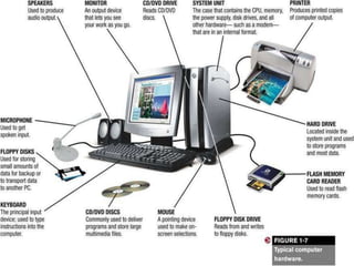 A computer is an electronic device that can be programmed to perform logical and arithmetic operations. It consists of a central processing unit (CPU) and memory. The CPU contains an arithmetic logic unit that performs calculations and a control unit that directs operations. Memory stores programs and data. Peripheral devices allow information to be input and output. Early computers were room-sized, while modern computers are integrated circuits that can fit into mobile devices. Personal computers are ubiquitous and embedded computers are in many devices.