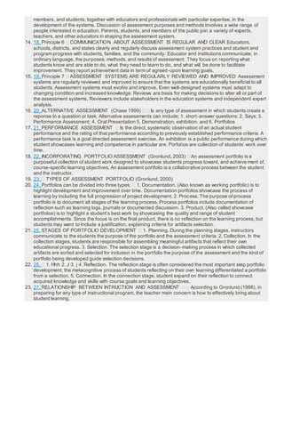 3. Assessment data is used for many purposes like direct instructional decisions, program evaluation, and expanding the knowledge base. Assessment involves setting learning goals, evaluating student progress towards those goals, and using the results to improve programs.