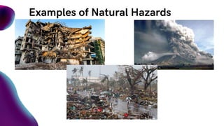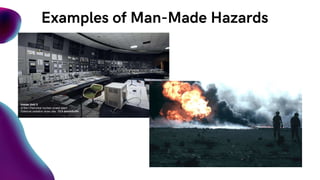 This document discusses different types of hazards and how they can be profiled. It defines a hazard as a threat or harm that can cause damage. Natural hazards are caused by natural processes of the Earth, while man-made hazards are generally caused by human errors, intent, or negligence. Hazards can be profiled based on their magnitude, frequency, duration, and causal effects. The magnitude can be measured scientifically, frequency indicates how prone an area is to a hazard, duration can be short or long term, and causal effects can be direct or indirect. A hazard-prone area is a location likely to experience a natural hazard without preventive measures.
