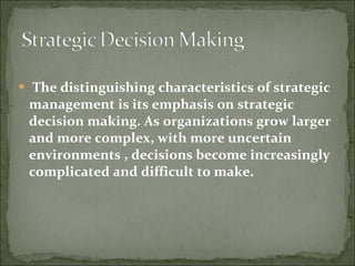 Strategic decision making deals with long-term, unusual decisions that commit substantial resources across an entire organization. There are four modes of strategic decision making: entrepreneurial, adaptive, planning, and logical incrementalism. The strategic planning process involves evaluating current performance, scanning the external and internal environments, analyzing strategic factors, generating and selecting strategies, implementing strategies, and providing feedback. A strategic audit systematically examines and evaluates strategic management processes and measures corporate performance against strategic goals to identify deficiencies.