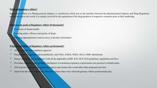 Regulatory affairs professionals act as the interface between the pharmaceutical industry and drug regulatory authorities. Their main goals are to protect human health, ensure drug safety and quality, and ensure accurate product information. Key roles include liaising with regulatory agencies, preparing regulatory submissions, and advising on regulatory requirements and guidelines. An investigational new drug (IND) application is filed with regulatory agencies to legally test an experimental drug in humans after preclinical testing. A new drug application (NDA) is filed to obtain approval to market a new drug, while an abbreviated new drug application (ANDA) is filed for generic drug approval based on demonstrating bioequivalence to an existing drug. Drug master files and active substance master files provide confidential manufacturing