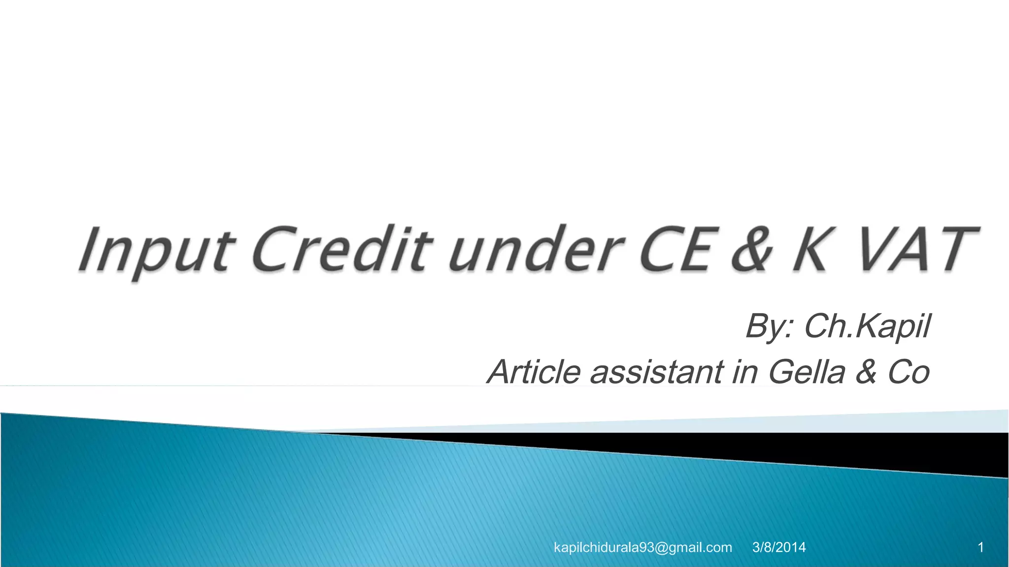 This document defines key terms related to input credit for VAT, excise duty, and service tax. It discusses how input credit can be availed for these taxes by manufacturers, importers, and first/second stage dealers based on statutory documents. Input credit for capital goods can be availed 50% in the current year and 50% in the next year for excise duty, but 100% in the current year for other duties and VAT. Service tax input credit is allowed based on input services involved in manufacturing or service provision. The document also covers identification of capital goods, cases of potential confusion in availing input credit, and penalties for wrongly availing input credit.