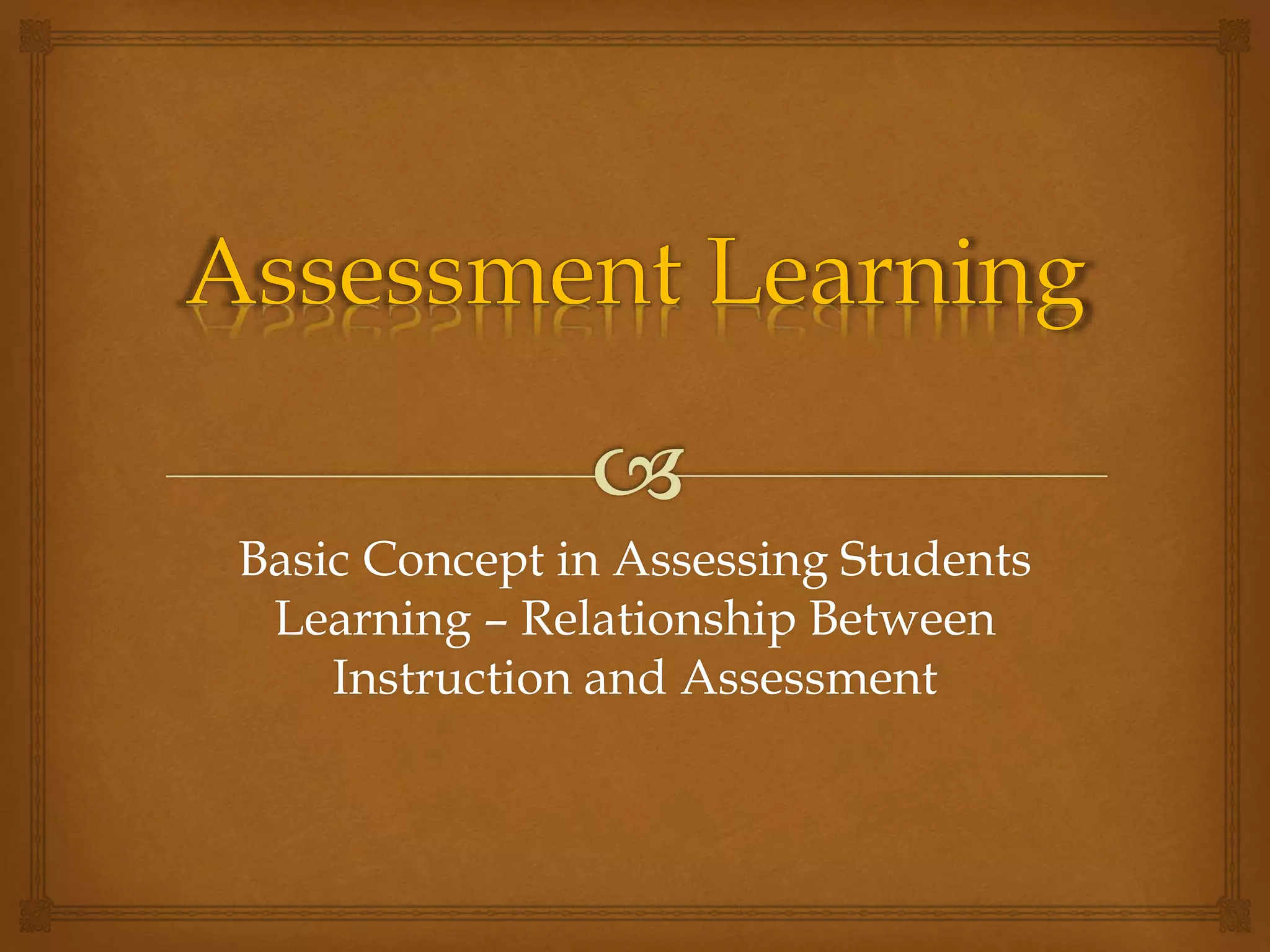 The document discusses concepts related to assessing student learning, including defining measurement, methods of data collection, uses of educational measurement, evaluation, assessment of student learning, and principles of assessment. It provides details on formative, summative and evaluative assessment, as well as alternative assessments including performance assessments and incorporating portfolio assessment into the learning process. The relationship between instruction and assessment is that assessment should effectively measure student learning and provide feedback to improve instruction.