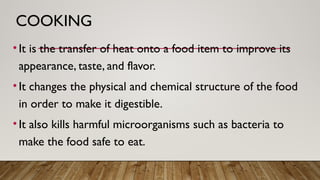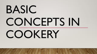 The document provides an overview of basic concepts in cookery, emphasizing the importance of heat transfer in cooking methods and the effects of heat on food. It differentiates between dry heat and moist heat cooking methods while highlighting the relevance of cooking skills for personal development and health. Additionally, it outlines various culinary career opportunities, including chefs, restaurant managers, and food writers.