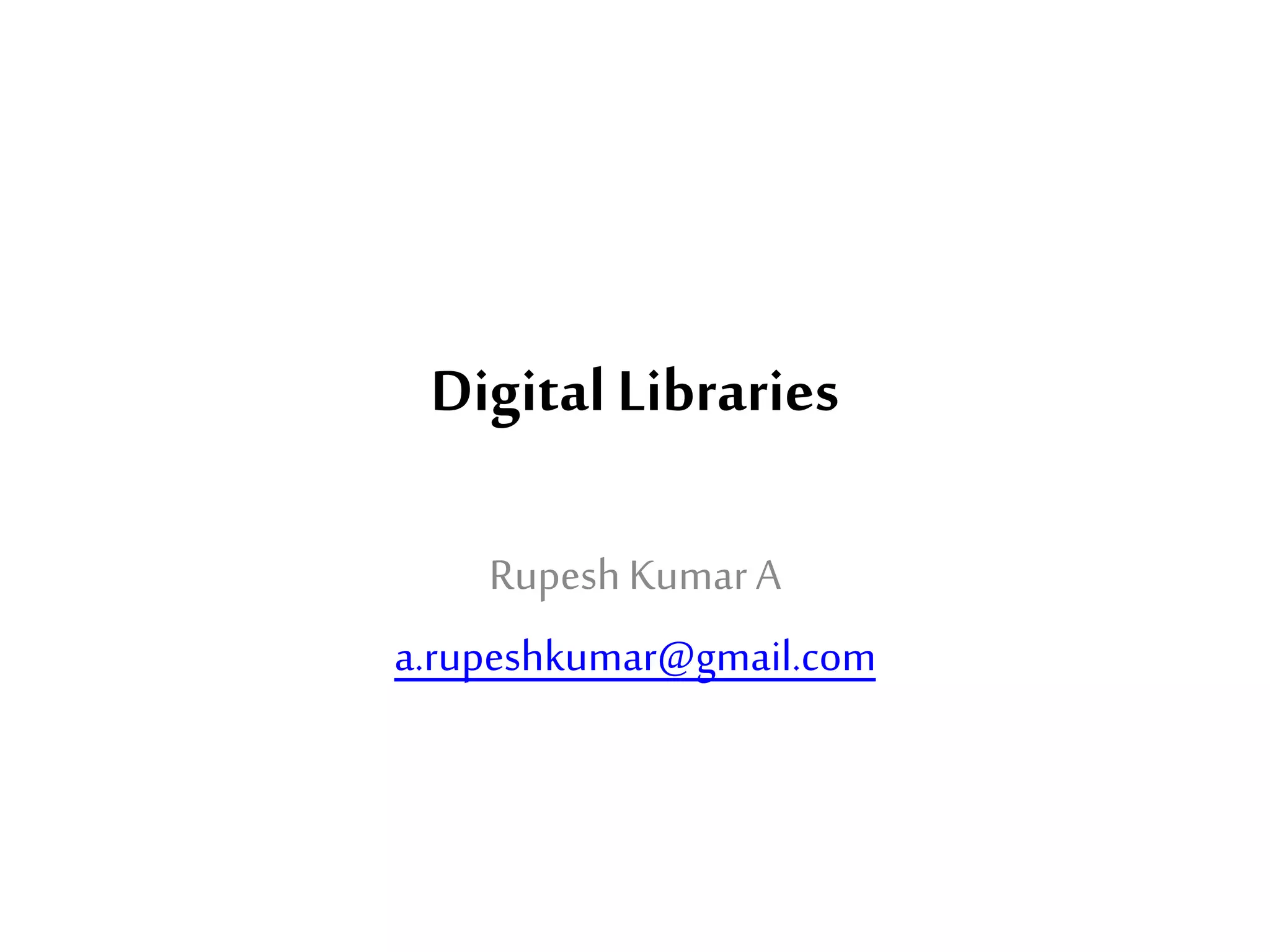 Digital libraries are defined as collections of digital objects, including various media formats, and provide access and retrieval methods for users. They differ from traditional libraries and websites by offering unlimited access points, multimedia content, and structured metadata, enabling easier updates and information sharing. The growth of digital libraries is influenced by advancements in technology, such as cheaper electronic storage and improved network capabilities.